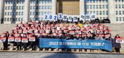 지난 28일 오전 11시 국회 본청 앞에서 ‘소선거구제 OUT, 2023 정치개혁의 해 선포’ 기자회견이 개최되었다.