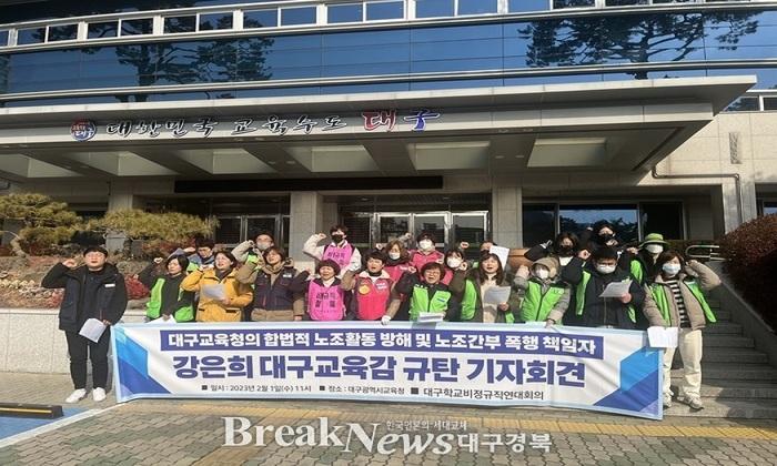 단체는 " 지난 1월 10일 오전 10시, 강 교육감의 지시를 받은 교육청 직원들이 교육청 앞에서 집회를 준비하고 있던 전국학교비정규직노동조합 대구지부의 여성간부들을 힘으로 밀치며 집회물품을 빼앗아 강제로 파손시켰다."고 주장했다.