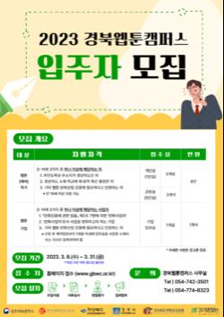 【브레이크뉴스 안동】이성현 기자=경상북도콘텐츠진흥원(원장 이종수, 이하 진흥원)이 운영하는 경북웹툰캠퍼스(이하 캠퍼스)는 2023년 신규 입주자를 모집한다고 16일 밝혔다.
