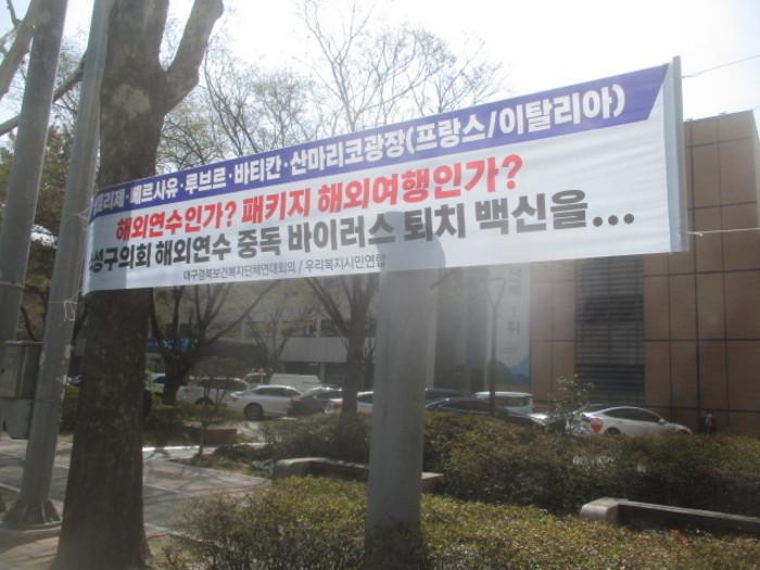 단체는 지방 의회의 외유성 해외연수 중단을 촉구하는 현수막을 사대부고, 수성구청 등 거리에 걸었다.