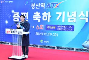 이날 기념식에서 조현일 경산시장은 “연말에 시민들과 함께 큰 경사다. 이제부터는 경산에서도 아침 시간과 저녁 시간은 물론 낮 시간대에도 KTX 이용이 가능해 시민 불편이 많이 해소되고 도시 브랜드 경쟁력도 높일 수 있을 것”이라며“KTX 증편 운행과 함께 내년 12월 운행 시작 예정인 대구권 광역철도와 더불어 새롭게 추진 중인 대구도시철도 2호선 광역철도 연계선 구축에도 박차를 가해 시민이 행복한 경산을 만드는 데 최선을 다하겠다”고 밝혔다.