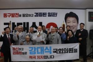 On the 28th, seniors in the Dong-gu culture and arts community, including National Intangible Cultural Heritage No. 55 Soran Eom Tae-jo, visited the election office of prospective candidate Kang Dae-sik and declared their support, saying, “The only person qualified to lead the development of Dong-gu is Kang Dae-sik, a proven worker.”