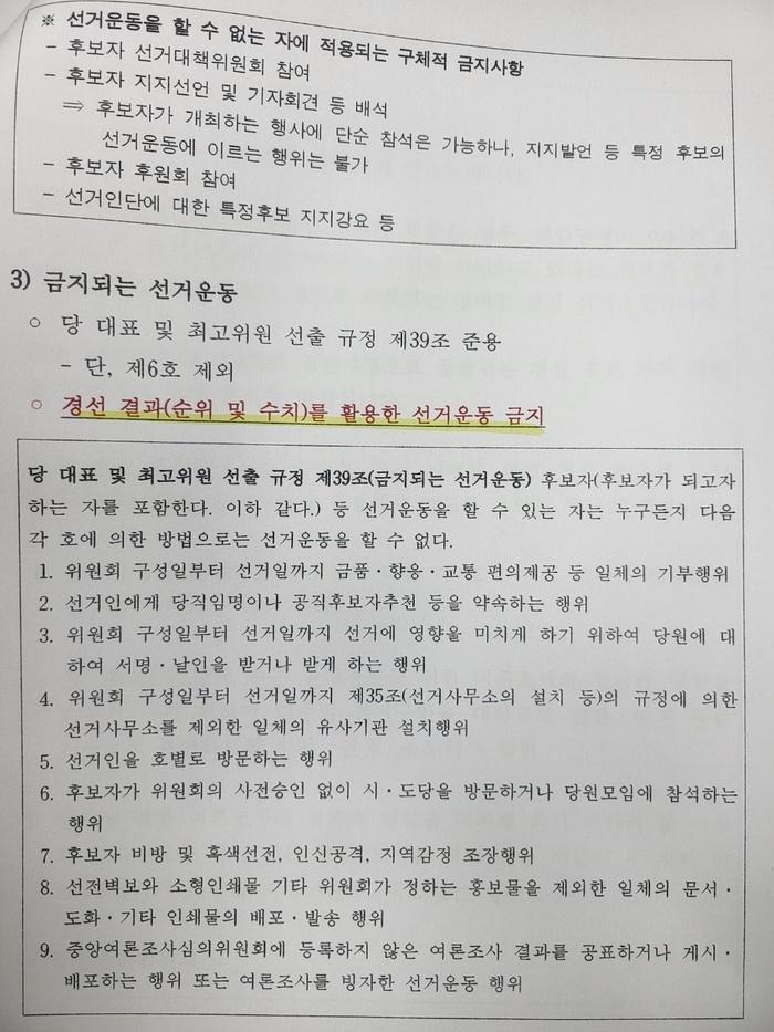 국민의힘 공관위는 지난 3월 5일 이 지역에 대한 경선 절차 개시를 선언하면서 “결선 후보자들이 1차 경선 결과를 선거운동에 이용할 수 없다”며 엄격한 제재를 예고했다. 당시 국민의힘 사무처 당직자는 “여기서 주의할 것은 결선 후보자는 1차 경선 결과를 선거운동에 이용할 수 없습니다. 저희가 1차에서 3차 경선 과정에서 결선에 가신 일부 후보가 언론이나 문자를 통해서 1차 경선 결과를 가지고 선거운동을 한 적이 있습니다. 공관위에서 엄중하게 판단했고, 주의 처분을 내린 바 있습니다. 양지해 달라”고 강조했다.