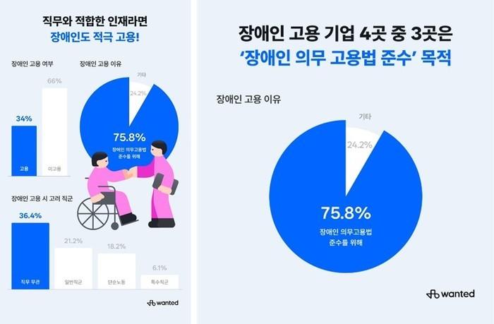 조사 결과, 전체 응답 기업의 34%가 장애인 고용 기업인 것으로 확인됐다. 이는 한국장애인고용공단의 장애인 고용률 조사와 같은 수치로, 주요 고용 이유를 묻는 질문에는 ‘장애인 의무고용법 준수’가 75.8%로 가장 높았고, '장애 유무와 관계없이 직무에 적합한 인재이기 때문'이라는 응답은 24.2%로 나타났다.