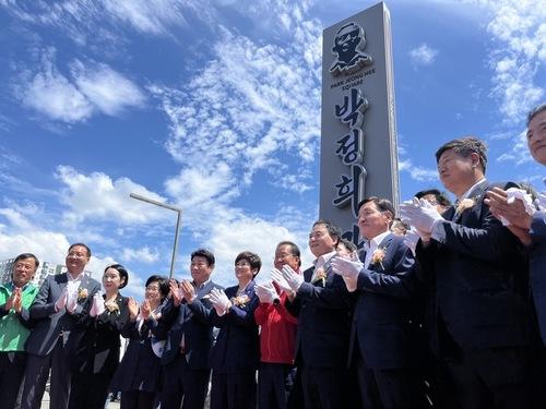 전날 미리 설치된 표지판은 높이 5m로 맨 위쪽에는 박정희 전 대통령의 얼굴이 그려졌고 아래에는 박 전 대통령 친필로 적힌 박정희 광장이라는 문구가 새겨졌다.