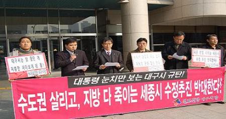 대구민주당과 대구자유선진당은 세종시 원안수정에 대해 강력한 비판을 쏟아내고 있으며 진보진영에서도 수도권을 살리기 위해 지방을 죽이려는 정권의 시도가 세종시 원안수정으로 나타나고 있다며 반대의 목소리를 높이고 있다. 특히 대구진보신당은 2일 오전 대구시청 앞에서 기자회견을 열고 지방의 위기가 닥쳤는데도 대구시가 중앙정부의 눈치만 보고 있다며 대구시를 비난했다. 조명래 위원장은 “이명박 대통령의 불도저식 (세종시)일방추진은 국민과 대화를 하지 않겠다는 오만함의 극치”라며 “국론 분열과 지방 죽이기 정책을 즉각 중단하라”고 촉구했다. 대구진보신당은 기자회견문을 통해 “정운찬 총리의 세종시 건설 원안수정 발언으로 시작된 논란이 정치권을 넘어 지역 간 갈등으로 이어져 국론이 분열되는 상황”이라며 “정부의 무책임한 정책이 국가 균형발전의 주요시책을 큰 혼란에 빠뜨리고 있다”고 비난했다. 또한 “세종시의 수정추진은 대구의 경우 첨복단지에 빨간 불이 켜지는 등 지역의 피해가 명백한데도 대구시는 시장이 입단속을 시키는 등 소극적인 대응으로 일관하고 있다”면서 “대구시가 정부의 눈치만 살피고 지역민의 바람에 침묵하는 행위는 도저히 묵과할 수 없는 일”이라고 지적했다. <저작권자 ⓒ 브레이크뉴스 대구경북 무단전재 및 재배포 금지>