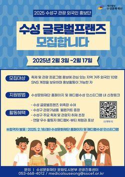 The Daegu Suseong Cultural Foundation announced on the 3rd that it is recruiting a foreign PR team called 'Suseong Global Friends'.