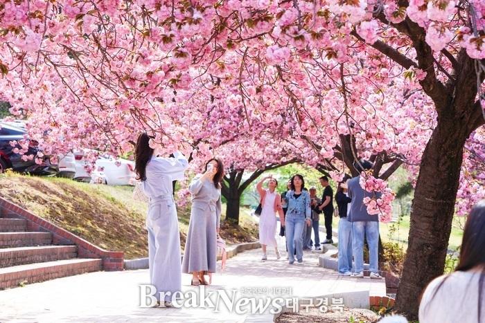 【브레이크뉴스 대구】진예솔 기자=대구대학교 경산캠퍼스 공공인재대학 건물 뒤편에 겹벚꽃이 만개해 사진을 찍으려 하는 재학생과 지역민의 발길이 이어지고 있다.