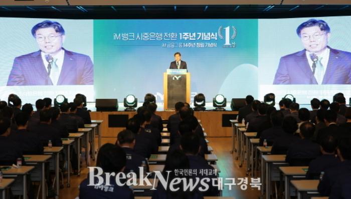 【브레이크뉴스 대구】이성현 기자=iM금융그룹(회장 황병우)은 16일 대구 수성동 본점에서 iM뱅크(아이엠뱅크)의 시중은행 전환 1주년과 그룹 창립 14주년 기념식을 동시에 개최하고 새로운 도약을 다짐했다.
