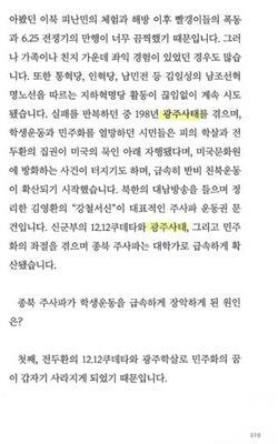 The problematic expression is the column titled “During Kim Moon-soo’s TV Broadcast” on page 219 of the book. In this column, candidate Kim was confirmed to have used the expressions “while experiencing the Gwangju Incident in 1980,” and “the December 12 coup d’état, the Gwangju Incident, and the frustration of democratization.”