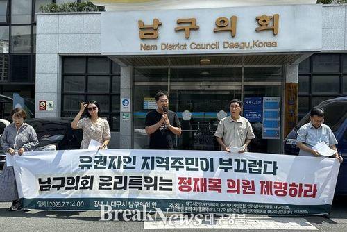 한편, 윤리특위 개최 전 대구시민단체연대회의 등 9개 단체는 남구의회 앞에서 기자회견을 열고 정 의원의 제명을 촉구했다. 이들은 “정 의원은 사회적으로 용납될 수 없는 범죄를 저질렀고, 이를 은폐하려 했다”며 “윤리심사자문위의 권고대로 즉각 제명해야 한다”고 주장했다.