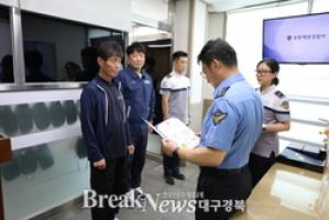 The Pohang Coast Guard presented certificates of appreciation to Lim Hyeon-cheol (41) and Kim Bu-sik (63) for rescuing a drowning person near the rocks off Homigot Gumanri.