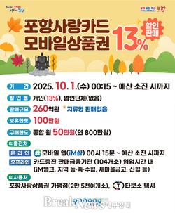 【브레이크뉴스 포항】박영재 기자=포항시는 추석 명절을 앞두고 지역경제 활력 제고를 위해 내달 1일부터 카드형·모바일 포항사랑상품권(포항사랑카드)을 260억 원 규모로 13% 할인 판매한다고 25일 밝혔다.