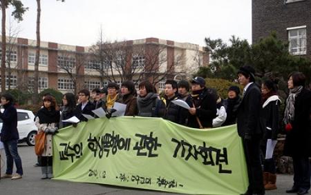 최성준 총학생회장과 대구여성회 김영순 회장, 대구.경북 대학생연합 간부 및 일반 학생 30여명이 함께 한 이날 기자회견에서 이들은 “학생들의 문제만이 아닌 학부모와 실상을 알게 된 모든 시민들의 문제“라며 이번 사건에 의미를 부여하고는 ”학교 측이 이 문제를 덮으려 하기 보다는 실상에 대한 정확한 조사를 통해 해당 교수에 대한 적정한 징계조치(파면)가 선행되어져야 한다“고 주장했다.