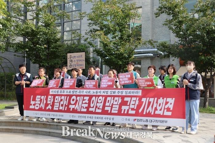 17일 민주노총 대구지역본부는 우 의원 사무실 앞에서 기자회견을 열고 “아리셀 유족을 모욕하고, 산업재해의 책임을 노동자에게 떠넘긴 망언에 대해 즉각 사과하고 의원직에서 물러나라”고 강하게 비판했다.
