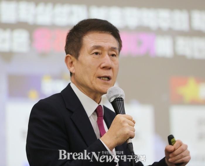 Pohang Mayor Lee Kang-deok attended the "TK100 Forum" held at the Daegu Sports Industry Support Center on the 13th and presented Pohang City's future industrial vision and steel industry innovation strategy.