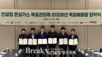 【브레이크뉴스 대구】이성현 기자=한국부동산원(원장 손태락)은 27일 SK에코플랜트㈜, HDC현대산업개발㈜, DL건설㈜, ㈜태영건설과 2026년도 온실가스 감축 업무협약을 체결했다고 밝혔다. 이번 협약은 온실가스 목표관리제 대상 건설사의 감축 목표 달성과 지속가능한 건설환경 조성을 위해 마련됐다.