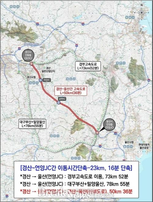 ‘경산~울산 고속도로’는 경산시 진량읍에서 울산 울주군 언양읍을 잇는 총연장 50㎞ 규모의 신설 노선이다. 그동안 자동차 부품 산업이 집적된 경산에서 완성차 산업의 중심지인 울산으로 이동하기 위해서는 신대구부산고속도로를 우회해야 해 물류비용 증가와 이동시간 지연, 기업 경쟁력 약화로 이어져 왔다. 이로 인해 경산 지역 기업 유치에도 어려움이 컸다는 평가다.