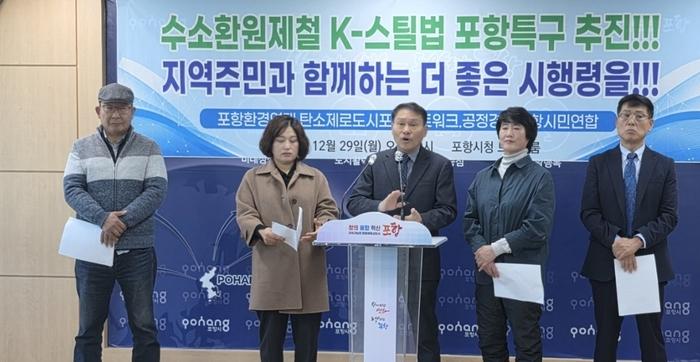 The Pohang Environmental Network (Co-Representatives Son Jong-soo and Yoo Seong-chan), the Carbon Zero City Pohang Network (Representative Jeong Eun-sook), and the Fair Economy Pohang Citizens' Coalition (Co-Representatives Han Yoo-sung and Kim Hong-ryeol) held a joint press conference in the briefing room of Pohang City Hall at 10:00 a.m. on December 29th. They called for the promotion of the "Low-Carbon Steel Pohang Special Zone" and the enactment of an effective enforcement ordinance for the K-Steel Act.