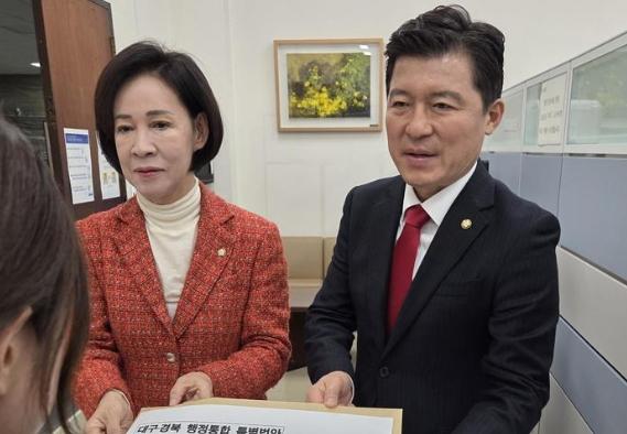 On the 30th, People Power Party Gyeongbuk Provincial Party Chairman Koo Ja-geun and Daegu City Party Chairman Lee In-sun proposed the "Special Act on the Establishment of Daegu-Gyeongbuk Special City and the Creation of a New Economic Axis for the Korean Peninsula," which will determine the fate of the administrative integration of Daegu and Gyeongbuk.