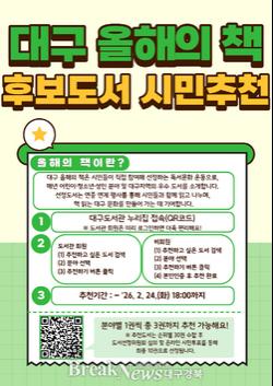 Recommendations are limited to: 1) books published by domestic authors within the past two years; 2) books with a resonant theme; and 3) books with the potential to become steady sellers. However, religious or politically oriented books and books previously selected as "Daegu Books of the Year" are excluded. The submission period ends at 6:00 PM on February 24th.
