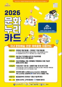 카드 신청은 11월 30일까지 전국 읍·면·동 주민센터와 ‘문화누리카드’ 누리집, 모바일 앱을 통해 가능하며, 발급된 카드는 12월 31일까지 사용할 수 있다.