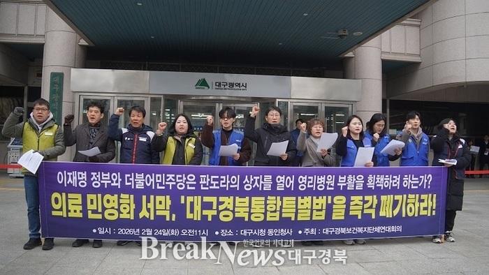대구경북보건복지단체연대회의는 24일 오전 11시 대구시청 동인청사 앞에서 기자회견을 열고, “통합특별법은 지역 균형발전이 아닌 의료 영리화를 제도화하려는 개악안”이라고 주장했다. 연대회의는 “시·도민 생명과 안전을 담보로 한 졸속 통합을 즉각 중단해야 한다”고 목소리를 높였다.