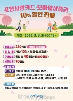 【브레이크뉴스 포항】박영재 기자=포항시가 지역 경기 회복과 민생경제 안정을 위해 카드형·모바일 포항사랑상품권(포항사랑카드) 230억 원을 10% 할인된 금액으로 추가 판매한다.