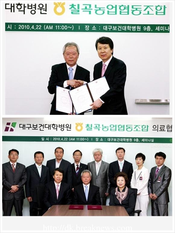 대구보건대학병원과 칠곡농업협동조합은 22일 대구보건대학병원 9층 세미나실에서 의료협약을 체결했다. 남성희 대구보건대학총장과 김한수 병원장, 정병인 조합장 등 양 기관 관계자 15명이 참석한 가운데 열린 이날 협약식에서 양 기관은 지역 경제와 보건ㆍ의료발전을 위한 다양한 프로그램을 개발하고 양 기관의 발전과 지역사회발전을 위해 공동 노력하기로 했다. <저작권자 ⓒ 브레이크뉴스 대구경북 무단전재 및 재배포 금지>