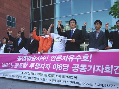 대구지역 야6당은 5월 7일 오전 대구 MBC 앞에서 ‘공영방송사수·언론자유수호 MBC노동조합 투쟁지지 야6당 공동기자회견’을 가졌다. 대구 MBC 노조 심병철 지부장, TBC 노조 석성진 지부장 및 야6당의 대표자, 당직자들이 참석해 ‘MBC 힘내라’를 한 목소리로 외쳤다. 민주노동당 이병수 대구시장 후보는 “MB 정권의 언론장악음모와 김재철 사장의 약속 불이행이 지금의 상황을 만든 것”이라며 비판했다. 또한 이 후보는 “MBC 노조가 김재철 사장의 약속 이행을 요구했는데 돌아온 건 민형사상 고소로 적반하장이 따로 없다. 김재철 사장은 사퇴해야 한다”고 주장했다. 야6당의 대표자는 기자회견문을 통해 “언론의 자유를 위해 싸우는 MBC 노조 이근행 본부장과 조합원들의 투쟁은 정말이지 감동적이고 누리꾼들과 시민들의 응원으로 투쟁의 열기는 높아지고 있다”며 “야6당도 힘을 모아 MBC와 함께 싸울 것”이라고 다짐했다. 기자회견장에는 진보신당 조명래 대구시장 후보와 민주노동당 이영재 기초후보(북구 아), 황순규 기초후보(동구 나), 창조한국당 김태훈 시의원후보(중구 1)도 참석했다.