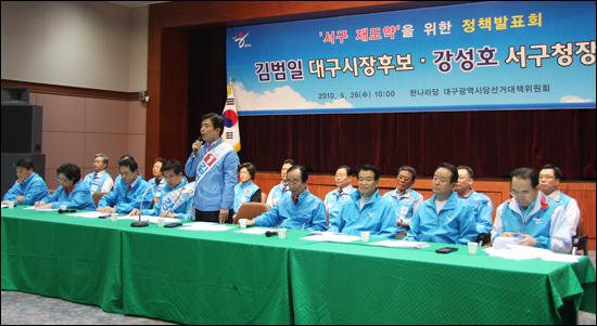 한나라당 대구시당 선거대책위원회는 26일 오전10시 서구 중리동 한국섬유개발원에서 홍사덕 서구당협위원장, 서상기 시당선대위원장, 주성영 총괄본부장, 배영식 정책본부장, 조원진 조직본부장, 서구 광역 및 기초의원 후보자 등이 참석한 가운데 ‘김범일 대구시장 후보·강성호 서구청장 후보 서구 재도약을 위한 정책발표회’를 열었다. 한나라당의 이번 정책발표회는 서구청장 및 서구 광역·기초의원 선거판세가 한나라당 후보에게 불리한 것으로 분석되자 서구가 종전에는 20세기 대구발전의 견인차였으나 섬유산업의 퇴색과 수성구 및 인근 달서구 개발로 인한 인구이동으로 낙후된 지역이란 점을 강조, 이를 극복하기 위해 강력한 여당 후보의 당선이 절실하다는 점을 강조하기 위함이다.