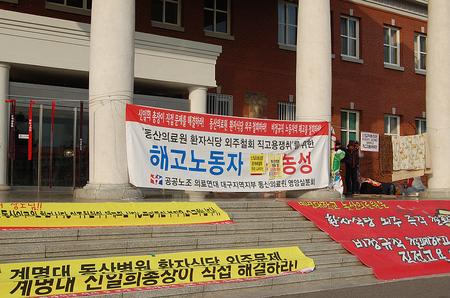 동산의료원의 환자식당 외주화 과정에서 해고당하자 지난 6월1일부터 해고자들이 복직을 요구하며 농성을 벌여 지역 노동계의 최대 현안문제로 떠오른 동산의료원 환자식당 사태가 시태발생 5개월을 넘겨 타결의 가닥을 잡았다. 동산의료원은 직영으로 운영되던 환자식당을 풀무원ECMD에 위탁했고 풀무원ECMD는 다시 인력파견업체 '유니토스'와 인력공급 하청을 해 동산의료원 식당에서 일하던 여성근로자들을 집단으로 해고해 강력한 반발을 불러 왔었다. 주로 여성인 해고당한 노동자들의 복직요구가 길어지면서 대구에서는 29개의 시민사회단체가 대책위를 만들었으며 지난 10월 25일부터는 동산의료원 환자식당 노동자 2명과 노동계 인사들이 대구 계명대 현관 앞에서 단식노숙 농성에 들어가 동산의료원과 재단측인 계명대를 압박해 왔다. 사태발생 5개월 만에 처음으로 대책위와 풀무원측과의 교섭이 이뤄져 여성근로자들을 복직하는데 원칙적으로 합의했지만 풀무원측이 노조 분회장과 사무장의 복직불가를 주장해 협상이 원잠으로 돌아갈 위기에 처했었다. 함께 해고됐던 식당 근로자들은 선별목직에 강한 거부감을 나타냈고 민주노총 등 노동계가 총 연합해 단식농성과 총력 결의대회를 잇따라 발표하고 나서자 이에 부담감을 느낀 동산의료원이 풀무원의 입장변화를 종용, 실무자 선상에서는 사실상 합의에 이르렀다. 기금까지 알려진 협상의 대강은 해고된 여성근로자 10명 중 조합원인 8명은 즉시 복직시키고 분회장과 사무장은 2개월 이내에 복직시킨다는 내용으로 타결분위기가 무르익자 대책위도 유화분위기를 조성하고 있다. 8일 예정된 동산의료원에서의 단식농성 돌입을 연기했으며 10일 예정된 총력결의대화도 잠정 연기한 상태다. 대책위 서창호 인권운동 활동가는 “병원 측이 협상의 타결국면을 감안해 농성과 결의대회 연기를 요청해와 이를 대책위 대표자회의가 받아들인 것”이라며 “하지만 수요일(10일) 12시까지 최종 타결안이 전달되지 않으면 즉각 강력한 투쟁을 재개할 것”이라고 말했다. <저작권자 ⓒ 브레이크뉴스 대구경북 무단전재 및 재배포 금지>