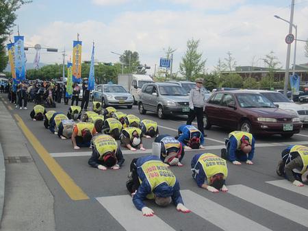 경북지역 노동자 50여명여 명으로 구성된 경상병원사태 경북도보순회투쟁단이 경산시청 앞에서 한나라당 최경환 의원 사무실 앞까지 3보1배를 했다. 이들은 경산삼성병원의 옛 경상병원 조합원들의 고용승계를 요구하고 있다. 이들은 지난 25일부터 30일까지 5박6일간 포항, 경주, 대구, 경산, 안동, 구미 등을 순회하며 노동계 현안해결을 촉구하고 있다. <저작권자 ⓒ 브레이크뉴스 대구경북 무단전재 및 재배포 금지>