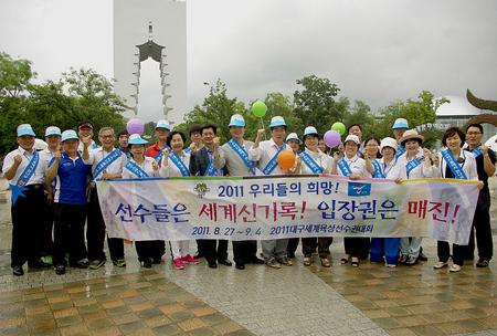 한나라당대구시당(위원장 주성영)은 휴일인 21일 오후1시 김규호 관람객유치특위위원장 및 위원, 대구시의원, 대학생 등 50여명이 참가한 가운데 경주엑스포공원에서 2011대구세계육상선수권대회 성공개최와 관람객 유치를 위한 마지막 홍보활동을 전개했다. 이번 홍보전은 전국에서 찾아온 경주세계문화엑스포 관람객을 대상으로 육상대회 홍보물을 나누어 주면서 입장권 매진임박을 알리고, 세계적인 육상스타들과 함께하는 대구세계육상선수권대회의 성공개최와 전국민의 관심을 이끌어내어 스포츠붐 조성을 위해 마련됐다. 또한, 대구시당은 육상대회 홍보를 위해 22일 오후 동대구역과 터미널 주변에서 ‘깨끗하고 친절한 대구! 손님맞이 대구지역 대청소’와 24일 오전 MBC네거리~범어네거리에서 한국청년지도자연합회 회원들과 함께 ‘Welcome~ 출근길 거리홍보’를 실시할 예정이다. <저작권자 ⓒ 브레이크뉴스 대구경북 무단전재 및 재배포 금지>