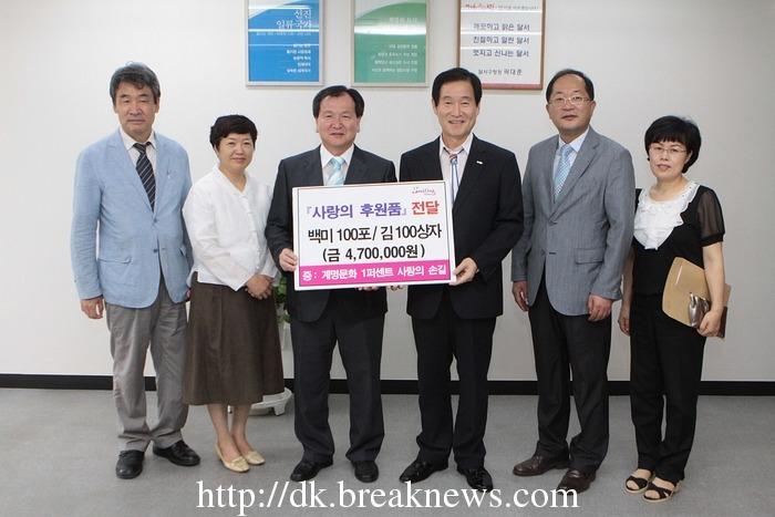 "1%의 사랑은 100%의 따듯한 사회를 만듭니다." 계명문화대학(총장 김남석) 전 직원들의 따스한 마음들이 뭉쳤다. 30일 이 대학 직원들은 조그만 정성을 모은 사랑의 후원품을 달서구청에 전달, 따스한 한가위 명절 맞이준비에 나섰다.