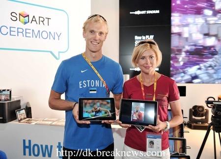 ▲ 30일 멀리뛰기 동메달리스트 라트비아의 이네타 라데비카 선수와 10종 경기 에스토니아의 미크 파하필 선수가 삼성전자 홍보관을 방문했다. 삼성전자는 두 선수의 대구 방문을 축하하기 위해 두 선수의 경기 사진이 담긴 갤럭시 탭을 증정했다.     © 이성현 기자