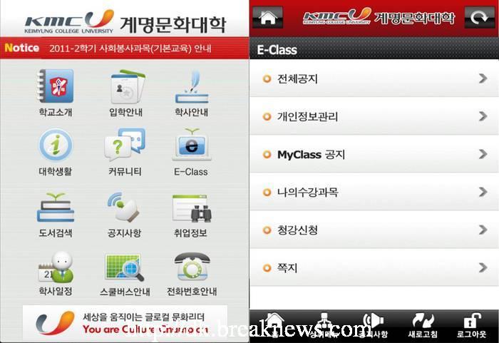 스마트폰을 이용해 전체 과목의 강의를 지원받는 서비스가 계명문화대학에 의해 처음으로 국내 전문대학에 선보인다. 계명문화대학은 이 서비스를 오는 10월 1일부터 본격 서비스에 들어가기로 하고 강의지원시스템 구축을 마무리했다. 이에 따라 학생들은 무료로 다운받을 수 있는 앱을 통해 수강중인 전체 과목의 과목별 공지사항과 강의노트, 수업계획서, 리포트 제출 및 확인 서비스 등 언제, 어디서나 수강, 성적, 학적 등의 다양한 정보를 제공받을 수 있게 된다.
