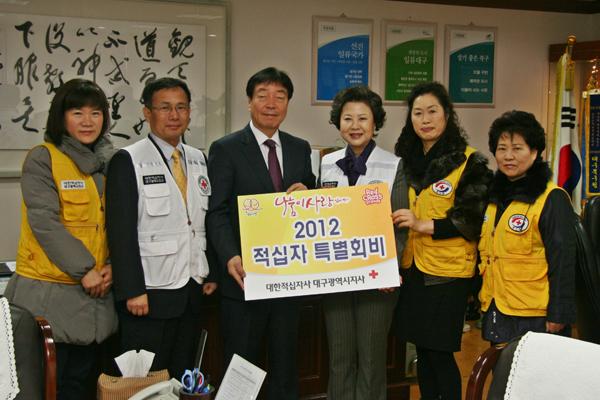 | ▲ 이종화 북구청장이 적십자 특별회비를 전달하고 있다 © 신수빈 기자 | | 경제 불황으로 혹독한 겨울을 나고 있는 이웃들이 많은 가운데 사회 곳곳에 사랑의 온기를 나누는 사람들이 있어 이웃들의 겨울나기가 그리 외롭지만은 않을 것으로 보인다. 이종화 대구 북구청청장이 17일 2012년 적십자 특별회비를 전달하며 “지역 취약계층을 위한 사회봉사활동을 활발히 펼쳐주길 바란다” 다고 말했다. 또한 1월 20일부터 2월 28일 까지 계획된 적십자회비 모금에 시민들의 적극적인 참여를 부탁했다.