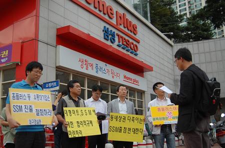 | ▲ 시민단체가 대형마트와 SSM의 무분별한 확장을 비난하고 있다. © 정창오 기자 | | 대형마트 및 기업형 슈퍼마켓(SSM)의 무차별적인 골목상권 침범은 서민들의 생존권을 침해하고 재벌들이 가져야할 사회적 책임과 도덕성을 방기한 것이란 비난이 적지 않은 가운데 대형마트들의 대구 공략이 이어지고 있다. 전국의 대도시를 중심으로 일반주거지역에 기업형 슈퍼마켓(SSM)이 무분별하게 늘어나 일반서민의 생계수단인 골목상권이 붕괴되는 등 심각한 사회문제로 부각되자 정부는 유통산업발전법을 마련해 내달부터 대형마트와 기업형 슈퍼마켓의 영업제한이 이뤄지지만 ‘공룡’에 비유되는 대형마트의 시장점유욕은 숙지지 않고 오히려 늘고 있는 상황이다. 대형마트의 수는 2002년 10곳에 불과했지만 지난해 연말 기준 무려 20곳으로 늘어났다. 올해도 대형마트의 진출이 계속돼 홈플러스가 중구 남산동 더 루벤스 주상복합 아파트 지하상가에 문을 열 예정이고 경산에도 개점할 예정이다. 유통업계에 따르면 조만간 2~3개의 대형마트가 추가로 들어설 것이란 예상이다. 기업향 슈퍼마켓의 경우 대구에서만 약50여개의 SSM이 영업을 시작했거나 오픈을 앞두고 있어 4천900여 동네슈퍼는 물론이고 1천200여개의 재래점포가 엄청난 매출감소로 인해 생존권을 위협받고 있는 상황이 심화되고 있다. 통계청의 대구 대형마트 매출 현황 분석 결과를 보면 2009년 2.1%, 2010년 10.3%, 지난해 11.3% 등 10%를 넘는 성장률을 보이고 있다. 대형마트 1곳당 월평균 판매액은 약 70억 원에 달한다. 대형마트 전체로는 1천400억 원으로 연간으로 치면 1조6천억 원이 넘는다. 고용창출 등의 순기능도 일부 있긴 하지만 수익금 대부분은 역외유출이 불가피하다. 또한 대형마트와 기업형 슈퍼마켓의 성장 뒤안에는 중소상인들의 피눈물이 존재한다, 대구경실련과 대구참여연대 등 대구지역 8개 시민단체들이 지난 2009년 ‘중소상인살리기 대구네트워크’를 발족하고 대구의 1천500여 영세상인들과 함께 대규모 규탄대회를 개최하는 등 대형마트의 무차별적인 출점저지를 위한 행동에 나섰지만 문어발처럼 늘어나는 대형마트와 기업형 슈퍼마켓의 대구진출을 막지는 못했다. 이러한 상황을 방치하게 된다면 대구시의 전통시장과 골목상권은 조만간 회생불능의 상태로 전락하고 이것이 지역경제의 기반전체를 허무는 악재가 될 것이란 우려는 날로 심화되고 있는 상황이다. 지난해 유통산업발전법(이하 유통법)과 대중소기업 상생협력 촉진에 관한 법률(이하 상생법)이 여야합의를 거쳐 개정돼 대구에서도 각 구․군에서 법 개정에 따른 조례제정이 완료됐거나 진행 중에 있다. 하지만 대구지역의 조례(안)들이 상생협력을 위한 법 취지를 살리지 못하고 오히려 그 취지를 반감시키고 있다는 지적이 제기되고 있다. 유통법과 상생법의 개정으로 대구시 8개 구․군의 경우 현재 중구가 의회에서 조례가 가결되었고 동구 등 6개 구․군이 입법예고를 마쳤으며 서구는 준비 중에 있으나 조례안이 지식경제부의 표준조례안에도 미치지 못하는 내용이 많아 법 개정을 무색하게 만들고 있다는 지적이다. 대구지역의 경우 6대 대도시중 가장 많은 자영업 인구가 등록되어 있는 곳으로 대형마트와 기업형 슈퍼마켓의 개점 확대는 가정 경제의 전부인 중소상인의 몰락은 서민경제의 파탄으로 이어질 것이 자명해 대구시가 책임지고 정책마련에 노력해야 한다는 요구가 빗발치고 있다.