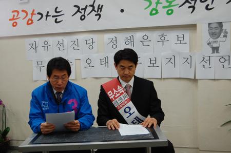 자유선진당 정해은 동갑 후보가 22일 공천권 반납과 후보사퇴후 무소속 오태동 후보를 지지하는 기자회견을 열어 자유선진당 대구시당이 허탈해하고 있다. 시당 관계자는 “공천장을 받고도 후보자 본등록이 시작되는 날 공천반납을 하다니 이게 무슨 짓이냐”고 강한 불쾌감을 나타냈다. 정 후보는 이날 오전 10시 오태동 후보사무실에서 “동구의 보수층은 젊고 유능한 지역의 인물인 무소속 오태동 후보로 대결집되어야 한다”며 “오 후보는 흔들리지 않는 신념과 뜨거운 열정으로 대구와 동구의 건강한 미래를 만드는데 노력해달라”고 당부했다. 오 후보는 정 후보의 지지선언에 고무된 표정이다. 오 후보는 지역 연고가 강한 정 후보가 후보직을 반납하고 자신을 지지해줄 경우 후보단일화라는 시각적 효과는 물론 새누리당 공천에 반발하는 지역 민심 결집에 상당한 영향을 미칠 것으로 내다보고 있다. 오 후보는 “선거일 20일 전 아무런 연고도 없는 사람을 낙하산 공천하는 새누리당의 오만함과 위원장직을 이용해 자신의 친구를 내려다 꽂은 현역의원의 방자함을 반드시 심판할 것”이라고 주장했다. 한편 자유성진당은 동갑 정해은 후보의 사퇴에 따라 북갑 이명숙 아름다운여행사 대표, 달서갑 김동국 정치학 박사, 달서을 김원이 전 대구시당위원장, 달성군 서보강 전 대구시의원 등 4명으로 출마자가 줄었다. <저작권자 ⓒ 브레이크뉴스 대구경북 무단전재 및 재배포 금지>