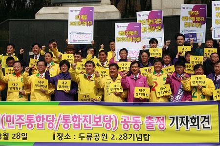 민주통합당 대구시당(윤덕홍 공동선대위원장)과 통합진보당 대구시당(백현국 공동선대위원장은 3월28일 11시 두류공원 2.28 학생의거 기념탑 앞에서 19대 총선 대구 야권연대 공동출정 기자회견을 열었다. 민주통합당 대구지역 후보 10명과 통합진보당 대구지역 후보 2명 등 12명의 야권연대 후보들과 각 당 관계자 등 50여명이 참석한 이 날 기자회견은 각 당 선대위원장의 인사말과 12명의 후보 소개, 각 당 시당위원장의 기자회견문 낭독 순서로 진행됐다. 백현국 통합진보당 대구시당 공동선대 위원장은 “이승만 독재정권을 몰아내는 기폭제가 되었던 2.28 기념탑 앞에서 4.11총선을 통해 MB정권을 심판하기 위해 두 야당의 후보들이 뜻을 함께하고 그것을 결의하는 이 자리의 의미가 매우 크다”면서 “새누리당 후보가 독식했던 대구지역에서 새로운 변화의 바람을 일으키자”고 밝혔다. 양당은 기자회견문을 통해 “대구시민들과 함께 새누리당 일당 독점의 시대를 끝장내고 대구를 활력있는 도시로 탈바꿈 시키기 위한 역사적인 첫 발걸음을 내딛고자 한다”고 밝혔다. 양당은 “서로 다른 민주통합당과 통합진보당이 대구에서 전례없이 야권연대를 이룩한 것은 다른 무엇보다 현 정권의 실정에 분노하고 새누리당 일당 독점 체제를 깨뜨리기를 염원하는 시민들의 열망을 무겁게 받아들인 결과”라며 “새누리당은 지난 4년의 집권기간 동안 민생을 파탄내고 경제를 거덜 냈으며 국정은 총체적으로 실패했다”고 비난했다. 양당은 또한 “대기업 위주의 수출 주도 정책과 부자 감세, 환경파괴 예산낭비의 4대강 사업으로 특권세력을 위한 정책만 추진했기에 물가는 폭등하고 서민은 못살겠다고 아우성”이라며 “대구에서 새누리당은 20년 가까이 모든 권력을 독점하고서도 시민들의 간절한 염원과 한없는 지지를 끝까지 배신하고 대구를 16개 광역시도 중 꼴지 경제 도시로 방치해 놓고 있다”고 주장했다. 양당은 “새누리당 박근혜 비대위원장은 여전히 대구 경북을 외면한 채 자신들의 기득권 유지에만 몰두하고 있다”면서 “이제는 대구도 새누리당 공천장만 받으면 아무나 당선되는 지역이 아니라 새누리당이 잘못하면, 변하지 않으면 심판받을 수 있는 지역이라는 사실을 보여달라”며 지지를 호소했다. <저작권자 ⓒ 브레이크뉴스 대구경북 무단전재 및 재배포 금지>