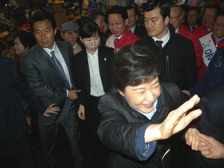지난 23일 전통적인 당 텃밭 지역으로 분류되는 대구·경북을 찾아 민심 달래기에 나선 박근혜 중앙선대위원장이 대구·경북 선거대책위원회 출범식에 참석한 다음 서문시장으로 이동해 시민들과 만난바 있다.