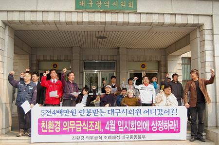 71일 만에 3만2천여명의 대구시민 서명으로 청구한 의무급식 조례가 서명기간 보다 2배 긴 130 여일 동안이나 대구시의회에 상정조차 못하자 친환경의무급식 조례제정 대구운동본부가 9일 대구시의회 앞에서 기자회견을 열고 대구시와 대구시의회의 도를 넘는 대구시민무시 행위이며, 재원부담을 내세운 대시민 협박이라고 비난했다. 그동안 시간끌기, 늦장처리로 비난받아 온 대구시는 의무급식 주민청구조례를 접수한 지 111일만인 지난 3월20일 ‘안정적 재원대책 부재’ 등의 이유로 ‘대구광역시 친환경 의무급식 등 지원에 관한 조례’를 반대한다는 의견을 달아 대구시의회에 넘겼다. 우리복지시민연함 은재식 사무총장의 사회로 열린 이날 기자회견에서 대구운동본부 관계자는 “시의원 1명만 발의하면 될 조례안을 시민 3만2천여명이 나서야 했다는 현실이 나섰는데도 3달이나 쥐고 검토만 하고 잇을 줄 몰랐다”면서 “이제 더 이상 기다릴 수 없으며 의회가 기대에 부응하지 못할 경우 ‘뭔가’를 보여주게 될 것”이라고 주장했다. 기자회견에 참석한 민주노총 대경본부 관계자는 “우리나라 행복지수가 OECD 꼴찌수준인데 대구는 그 중에서도 최악의 수준으로 모두 다하는 의무급식을 전혀 하지 않고 있는 도시”라면서 “의무급식은 대구시의 선택의 문제가 아니라 반즈시 해야만 하는 문제”라고 주장했다.