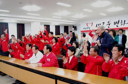 | ▲ 새누리당 경북도당과 대구시당 합동개표상황실에서 방송3사 출구조사에서 새누리당이 선전한 것으로 나타나자 환호성을 지르고 있다. ⓒ 정창오 기자 |