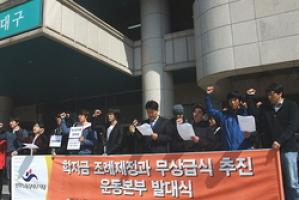 친환경의무급식대구운동본부는 “왜 대구의 아들 딸들이 다른 시·도에서 모두 시행하고 있는 의무급식의 혜택을 받지 못해야 하느냐”면서 “예산타령으로 시대적 흐름을 호도하지 말고 불요불급한 예산을 줄여 의무급식을 반드시 실현해야 한다”고 주장했다.
