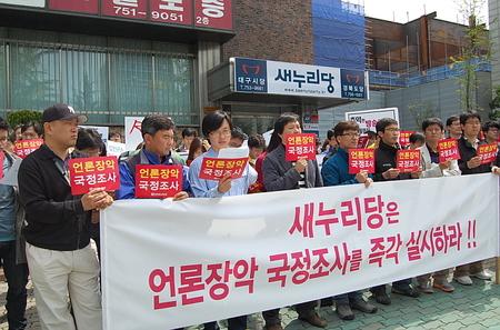 전국언론노동조합 문화방송본부 대구지부(이하 대구지부)는 20일 대구MBC를 비롯한 지역 6개사 사장과 자회사 3곳에 대한 김재철사장의 낙하산 인사 철회 촉구 총파업 돌입을 선언했다. 대구MBC 전 직원이 파업에 참여하는 것은 50년 역사에 처음 있는 일로 김재철 사장이 임기를 1년 앞두고 대구MBC사장을 전격 교체한데 대한 반발이다. 대구MBC사장의 경우 2007년까지 서울 본사 임원이 맡아왔으나, 2008년 첫 자사출신이 사장에 임명돼 박영석 사장 등 2차례 자체 승진했다. 대구MBC노조는 20일 오전 대구시청 지방기자실에서 기자회견을 갖고, 지난 19일 전격적으로 발표한 지역 6개사의 사장 내정은 김재철사장의 막장 인사의 결정판이라고 규정하고 대구MBC 보직간부 전원이 사퇴, 총파업에 돌입한다고 밝혔다. 대구MBC노조는 이에 앞서 이날 오전 8시30분 서울 여의도 MBC본사 앞에서 조합원 48명이 참석한 가운데 낙하산 인사 철회를 위한 집회를 가졌다. 권창모 지부장은 “청와대의 낙하산인 김재철 사장이 서울을 망쳐놓은 것도 모자라 지역 MBC까지 장악하려고 하고 있다”며 “지역 19개 지부는 낙하산 인사를 저지하고 지역방송사 자율경영의 전통을 지키기 위해 총력 투쟁을 벌일 것”이라고 밝혔다. 대구MBC노조는 이날 임명안이 주주총회에서 가결돼 통과되면 24일부터 모든 방법을 동원해 신임 사장의 출근을 저지할 것이라고 밝혀, 출근을 둘러싼 충돌이 예상된다. <저작권자 ⓒ 브레이크뉴스 대구경북 무단전재 및 재배포 금지>