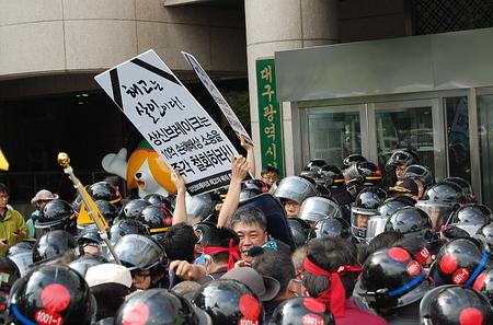 김범일 대구시장 면담을 요구하는 민주노총 대경본부 조합원들이 대구시청으로 몰려가 경찰과 충돌했다. 조합원들은 23일 오후 3시30분 대구시청 주차장에서 집회를 열고 4대강사업장 임금체불, 상신브레이크 해고자복직, 대구지하철 해고자 복직, 택시근로자 임금 현실화 등을 주장했다. 특히 노조원들은 대구지하철 조합원 해고자 문제에 대해 “7년 전 함께 해고됐던 전국의 해고자들은 복직이 되고 있는데도 대구만 유일하게 복직을 회피하고 있다”며 “대구시가 직접 이 문제에 대해 해결에 나서라”고 촉구했다.