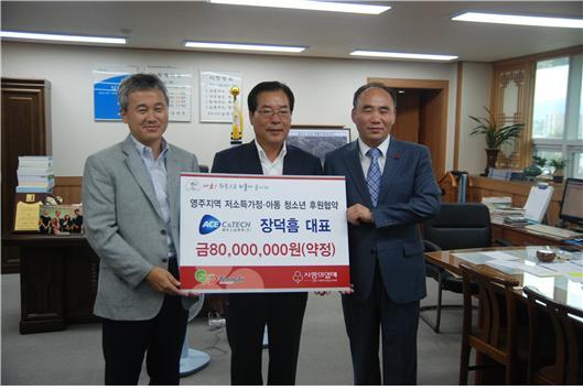 장덕흠 대표는 지난 2011년 12월 사회복지공동모금회 79호 아너소사이어티 회원으로 가입하였고, 1억원을 기부약정한 바 있다. 약정금액 중 2천만원은 장대표가 거주중인 서울 용산지역의 청소년들을 위해 사용됐고, 앞으로 기부 예정인 8천만원은 고향인 경북 영주지역의 아동․청소년들을 위해 사용하고 싶다는 장대표의 의사에 따라 이번에 후원약정식을 진행하게 됐다. 모금회 관계자는 “영주지역의 아동․청소년에 대한 복지인프라가 없는 상황에 꾸준한 지원을 약속받아 안정적인 재원을 확보할 수 있어 기쁘다” 며 감사인사를 전했다. 한편, 에이스씨엔텍(주) 지난 2000년 설립해 유럽과 일본으로부터 플라스틱에 전기를 흐르게 하는 원료를 수입,가공하는 업체로 국내 시장과 해외 반도체 관련 업계에 판매하고 있다. <저작권자 ⓒ 브레이크뉴스 대구경북 무단전재 및 재배포 금지>
