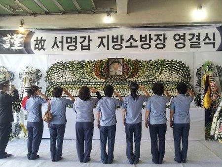 이날 영결식에는 유족과 이주석 경북도 행정부지사, 이기환 소방방재청장, 박두석 경북도 소방본부장, 박승호 포항시장, 도의원, 시의원, 의용소방대원, 소방행정자문단, 동료 소방관 등 400여명이 참석했다. 이주석 행정부지사는 故 서 소방장에게 1계급 특진을, 이기환 소방방재청장은 옥조근정훈장을 추서했으며 유해는 대전 국립현충원에 안장된다. 서 소방장은 지난 24일 폭우로 고립된 야영객 구조활동중 급류에 휩쓸려 실종 2시간만에실종지점보다 400미터 가량 떨어진곳에서 발견되 병원으로 후송되든중 순직했다. 2007년 2월8일 임용한 서 소방교의 유가족으로는 부모와 부인, 7세와 3세 자녀 2명이 있다. <저작권자 ⓒ 브레이크뉴스 대구경북 무단전재 및 재배포 금지>