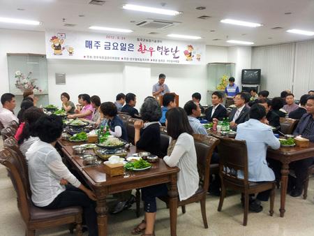 칠곡군농업기술센터 구내식당에서 유관기관 단체 및 주민 150여명이 참석한 가운데 열린 이번 행사는 한우자조금관리위원회에서 주최하고 한우협회칠곡군지부 주관, 칠곡군ㆍ구미칠곡축협에서 후원으로 열렸다. 이번 행사를 통해 FTA 체결과 사료값 폭등, 소값하락 등으로 어려움이 가중되고 있는 한우농가에 힘을 보태고 “매주 금요일은 한우 먹는날”로 지정, 소비자에게 한우고기의 우수성과 안정성을 홍보함으로써 한우소비 촉진에 동참토록 유도하기 위해 기획됐다. <저작권자 ⓒ 브레이크뉴스 대구경북 무단전재 및 재배포 금지>
